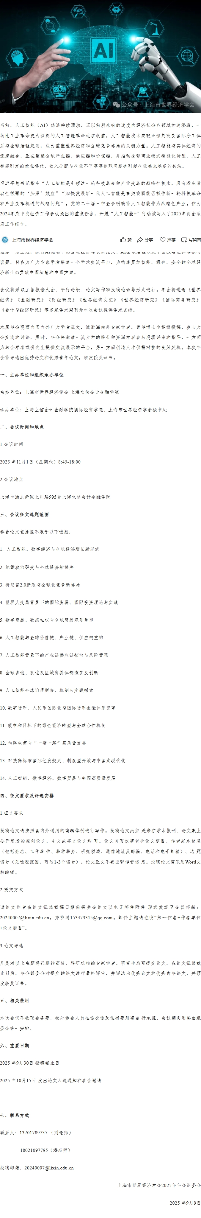 上海市世界经济学会2025年年会征文通知